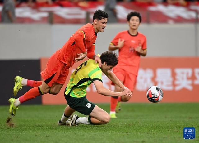 9月9日,中国队球员王钰栋(右)与澳大利亚队球员基利·亚当森在比赛中拼抢。