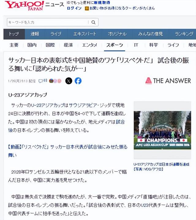 虽然中国U23在决赛中0比4不敌日本,最后只拿到亚军,但是日本球员却在赛后向中国队列队送上颁奖台,给予这支中国队极大的尊重,日本媒体对此也进行了报道。